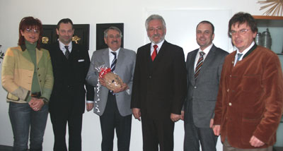 Oberbürgermeister Reinhold Perlak (3.v.r.), Gerhard Schmid, Leiter des Referats für Recht und Zentrale Verwaltung (rechts), und Tiefbauamtsleiterin Cristina Pop gratulierten dem Unternehmer Hans Georg Huber (3.v.l.) zum Umweltpreis 2006. Unser Bild zeigt außerdem (von links): Prof. Dr.-Ing. Martin Faulstich, Vorstandsvorsitzender der Firma ATZ, und Dipl.-Ing. Rudolf Bogner, Geschäftsbereichsleiter Schlammbehandlung in der Hans Huber AG.